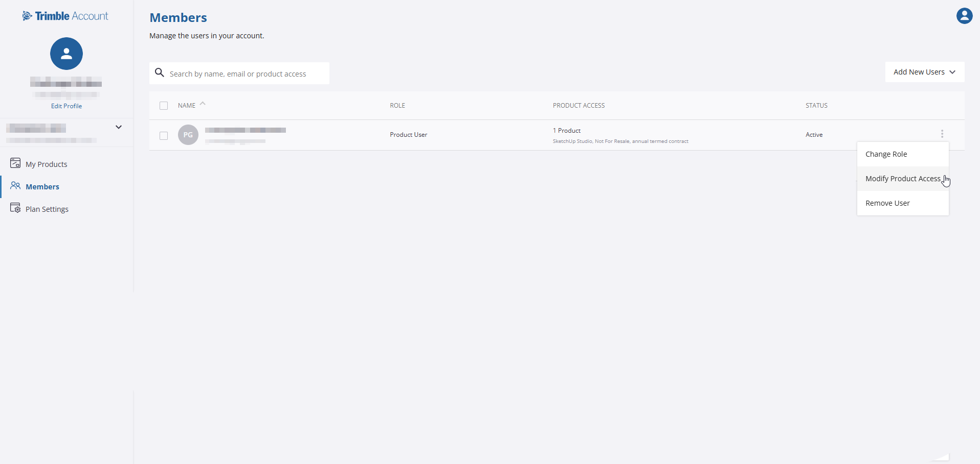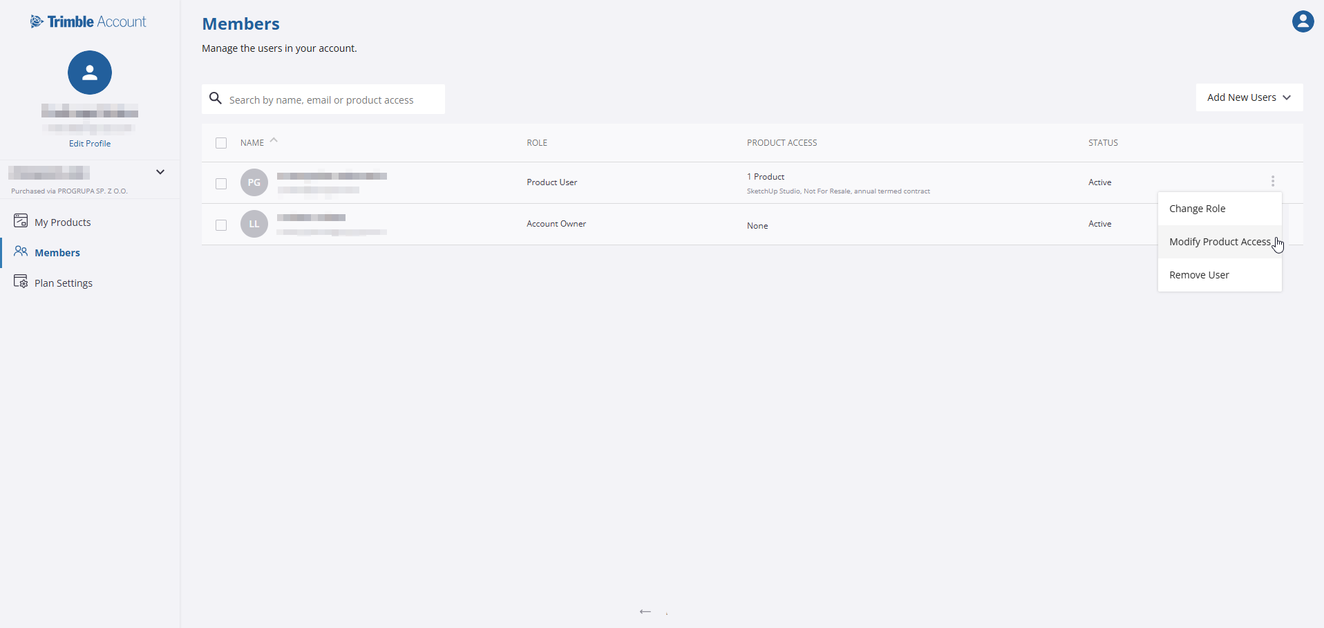 3. Klikając w ... przy swoim użytkowniku wybierz opcję Modify Product Access